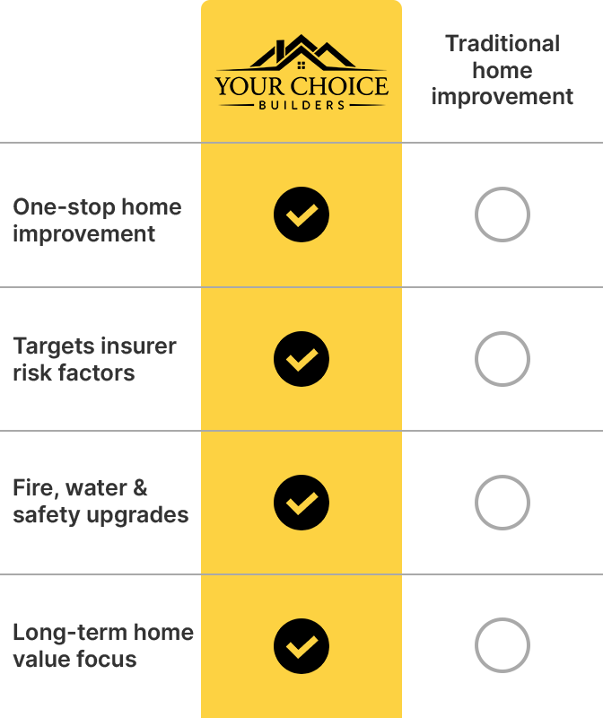 The longer risk factors like roof wear, fire exposure, or water damage go unaddressed, the harder (and more expensive) it becomes to secure coverage. With Your Choice Builders, finding out what insurers flag—and how to fix it—takes just seconds.